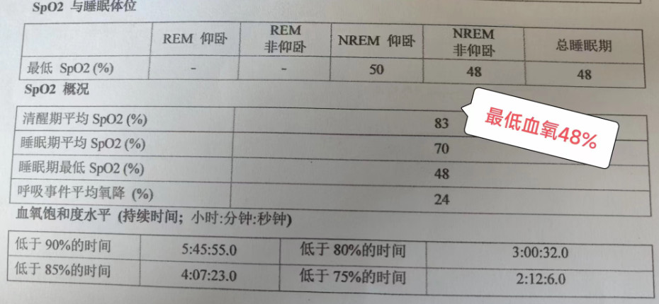 王女士(化名)身高156.5cm,體重90kg,BMI(體重指數(shù))36.7kg/㎡(BMI正常范圍是18.5~23.9),腰圍116cm,臀圍121cm,一晚上睡眠395分鐘中,呼吸暫停了427次,單次最長憋氣時間74秒,AHI指數(shù)(呼吸暫停、低通氣指數(shù))高達71.8。