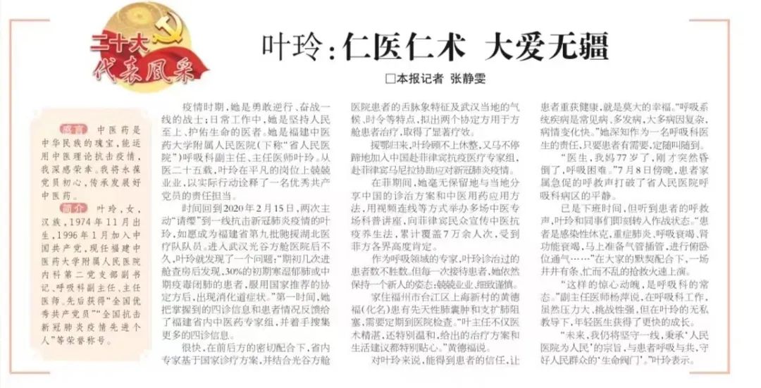 【福建日?qǐng)?bào)】二十大代表風(fēng)采|葉玲:仁醫(yī)仁術(shù) 大愛(ài)無(wú)疆