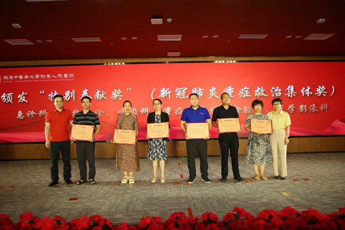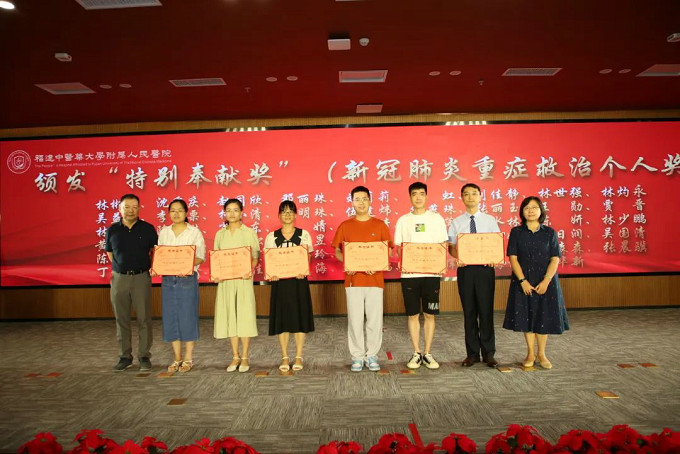 李瑋副院長宣讀表彰決定,醫(yī)院領(lǐng)導(dǎo)班子成員向從醫(yī)30年、退休老專家、援疆人才、新冠肺炎重癥救治集體和個人頒發(fā)“特別奉獻(xiàn)獎”。(獲獎名單附后)