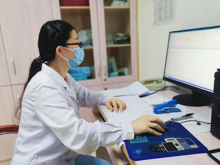 鄭寶乃醫(yī)生正在專注的為病人出胃鏡報告