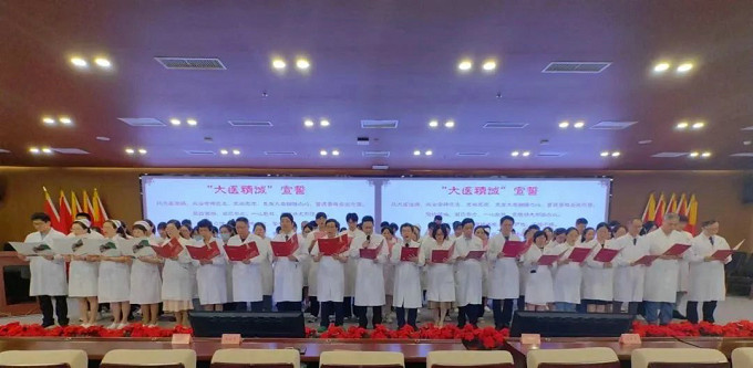 拜師儀式圓滿結(jié)束。程心玲副院長(zhǎng)、徐順貴副院長(zhǎng)帶領(lǐng)各位老師和同學(xué)們進(jìn)行大醫(yī)精誠(chéng)宣誓。