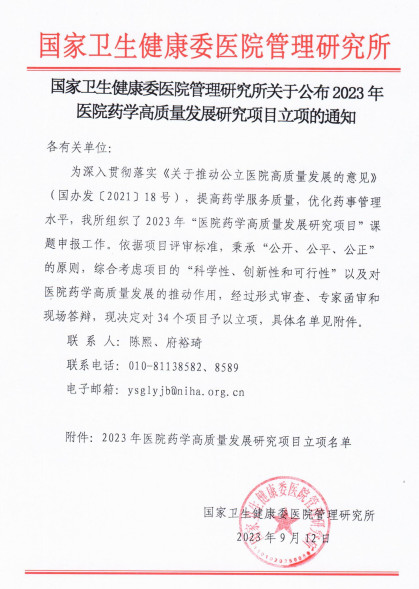 近日,國(guó)家衛(wèi)生健康委醫(yī)院管理研究所公布2023年醫(yī)院藥學(xué)高質(zhì)量發(fā)展研究項(xiàng)目立項(xiàng)名單。此次研究項(xiàng)目遴選面向全國(guó),綜合考慮項(xiàng)目的“科學(xué)性、創(chuàng)新性、可行性”以及對(duì)醫(yī)院藥學(xué)高質(zhì)量發(fā)展的推動(dòng)作用,經(jīng)過(guò)形式審查、專(zhuān)家函審和現(xiàn)場(chǎng)答辯,全國(guó)共遴選出34個(gè)項(xiàng)目立項(xiàng)。我院藥學(xué)部臨床藥學(xué)室副主任藥師章靚申報(bào)的《個(gè)性化院后慢病管理:掌上醫(yī)管家APP研究與開(kāi)發(fā)》獲批立項(xiàng),為我省唯一立項(xiàng)項(xiàng)目。