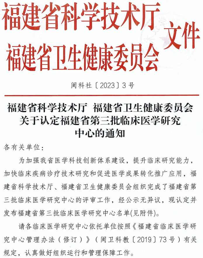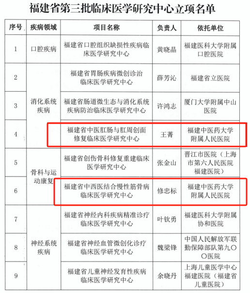 近日,福建省科學(xué)技術(shù)廳聯(lián)合福建省衛(wèi)生健康委員會共同發(fā)布了《關(guān)于認(rèn)定福建省第三批臨床醫(yī)學(xué)研究中心的通知》(閩科社(2023)3號)。我院再次獲批兩個省級臨床醫(yī)學(xué)研究中心,分別是“福建省中醫(yī)肛腸與肛周創(chuàng)面修復(fù)臨床醫(yī)學(xué)研究中心”和“福建省中西醫(yī)結(jié)合慢性筋骨病臨床醫(yī)學(xué)研究中心”。