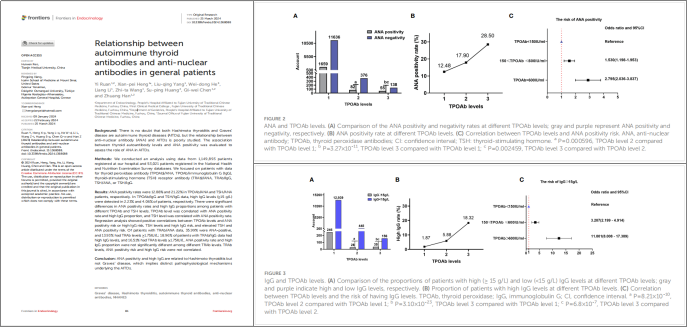 2024年3月25日,我院衡先培教授研究團(tuán)隊(duì),在JCR1區(qū)期刊《Frontiers in Endocrinology》上發(fā)表了一篇題為《Relationship between autoimmune thyroid antibodies and anti-nuclear antibodies in general patients》的真實(shí)世界臨床數(shù)據(jù)研究論文,研究團(tuán)隊(duì)通過(guò)醫(yī)院臨床科研一體化系統(tǒng)搜索出經(jīng)過(guò)嚴(yán)格脫敏后5396例的TPOAb、TRAb、TSH、ANA、IgG等臨床數(shù)據(jù),經(jīng)過(guò)醫(yī)學(xué)倫理委會(huì)審批同意后采用卡方檢驗(yàn)、Kendall's tau-b相關(guān)、logistic回歸統(tǒng)計(jì)分析方法,在分析普通患者人群中自身免疫性甲狀腺抗體與抗核抗體關(guān)系的基礎(chǔ)上,進(jìn)一步揭示橋本甲狀腺炎和格雷夫斯病之間存在免疫機(jī)制的差異。隨著臨床科研一體化平臺(tái)的不斷完善,研究技術(shù)的不斷提升,中醫(yī)元素的深度融合,相信會(huì)有越來(lái)越多的高質(zhì)量臨床研究論文產(chǎn)生并發(fā)表,不斷推進(jìn)我院中醫(yī)藥事業(yè)的傳承創(chuàng)新。