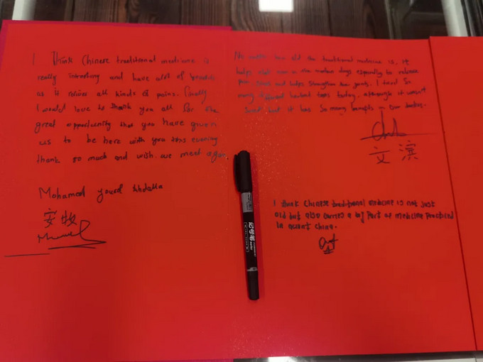 活動結束后,中外學員自發(fā)在簽名本上寫下了發(fā)自肺腑的體驗感悟,字里行間感受到了中醫(yī)藥文化的魅力,愛上中醫(yī)藥文化,并成為了中醫(yī)藥的"粉絲"。