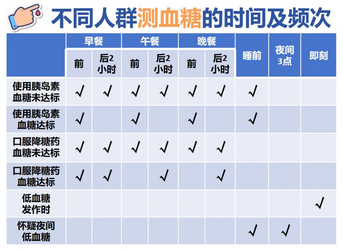 ●監(jiān)測(cè)時(shí)間:推薦根據(jù)不同的血糖控制方案選擇監(jiān)測(cè)血糖的時(shí)間點(diǎn),來(lái)幫助了解飲食和活動(dòng)對(duì)血糖的影響:如早餐前、午餐后2小時(shí)、晚餐前。